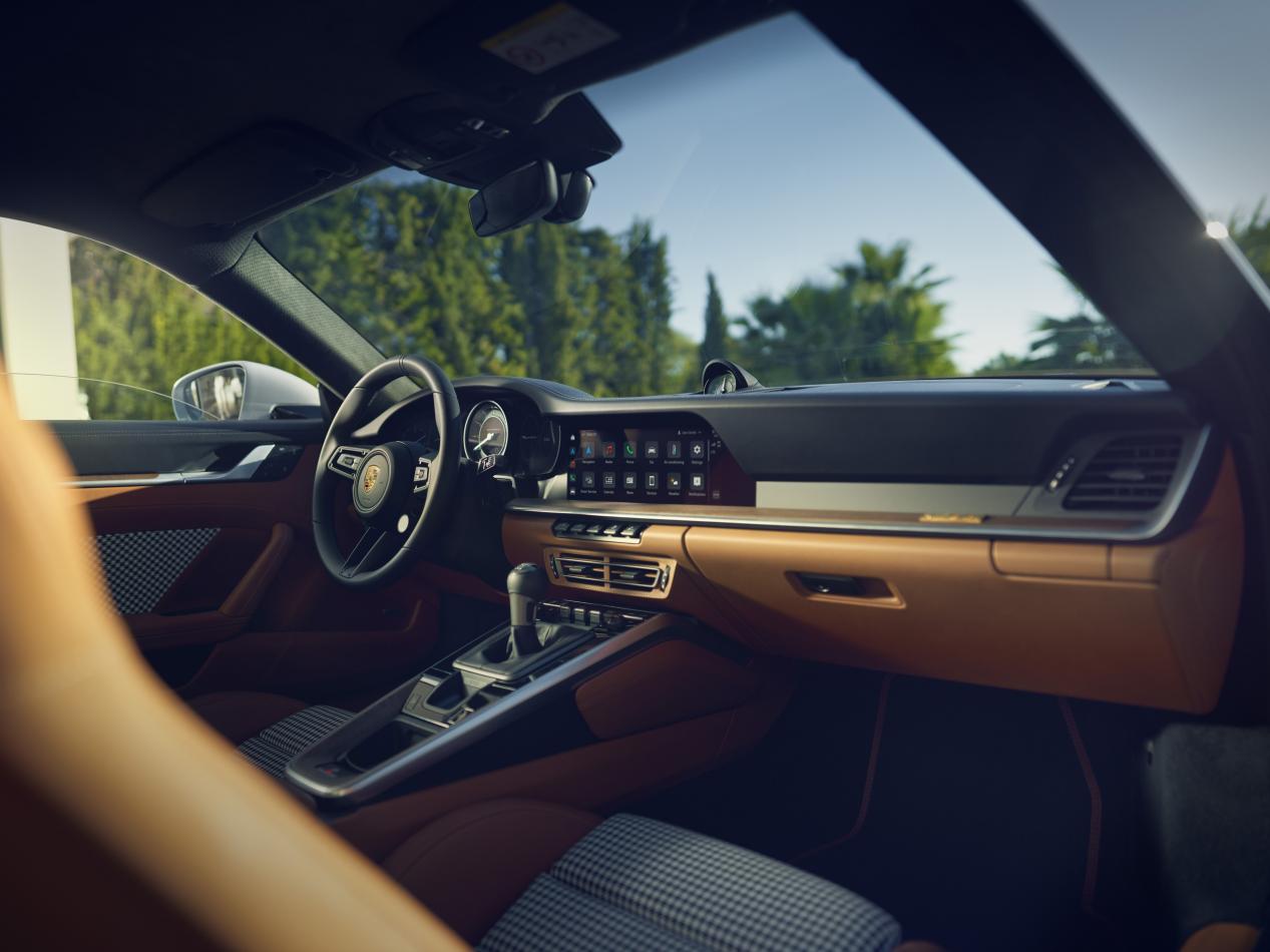 内饰方面,911 Sport Classic采用传统指针式仪表盘+液晶屏组成的经典五连表设计,搭配内嵌式中控屏带来了不错的科技氛围,而且棕色的半苯胺皮革显得很有档次感,当然最让人兴奋的还是中间的手动变速档杆。
